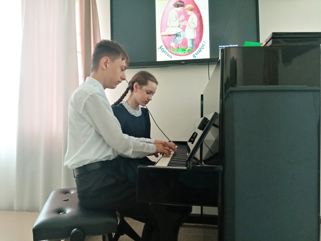 В музыкальной части утренника выступили учащиеся фортепианного отделения Детской школы искусств города Ставрополя: Арушунян Лия, Белоусов Илья (педагог Е.В. Митенко), Бахтин Лёва, Перов Коля, Латышева Маша, Афендиков Миша (педагог Р.А. Бандурина), Емасова Катя (педагог М.Я. Панина). Они исполнили пьесы П.И. Чайковского, написанные специально для детей. Ведущая Елена Викторовна Митенко из множества шедевров великого композитора выбрала произведения, особенно подходящие к светлому дню Воскресения Христова.