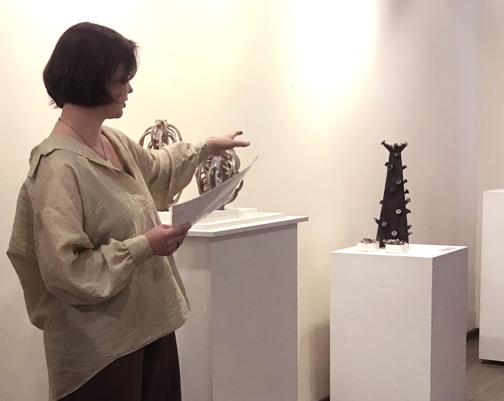 Содержание выставки раскрыла в авторской экскурсии Александра Владыкина. Представленные композиции – «Лёд», «Белая река», «Переплетения», «Первый снег», «Свет во тьме светит» и др. – вдохновлены природой. Ее мотивы проявляются в созданных предметах не прямо, а через формы, цвет, фактуры. Недаром выставке дан подзаголовок «Диалог природы и глины». Используя для создания художественных изделий простой природный материал, авторы призывают беречь планету. Эта идея выражена, например, в композиции-трансформере «Новая жизнь»: скульптуру в виде сухого дерева посетитель выставки может «оживить» цветами.