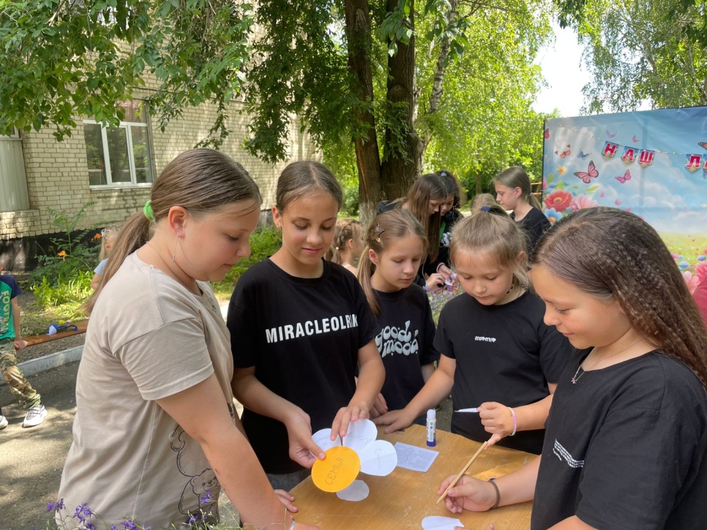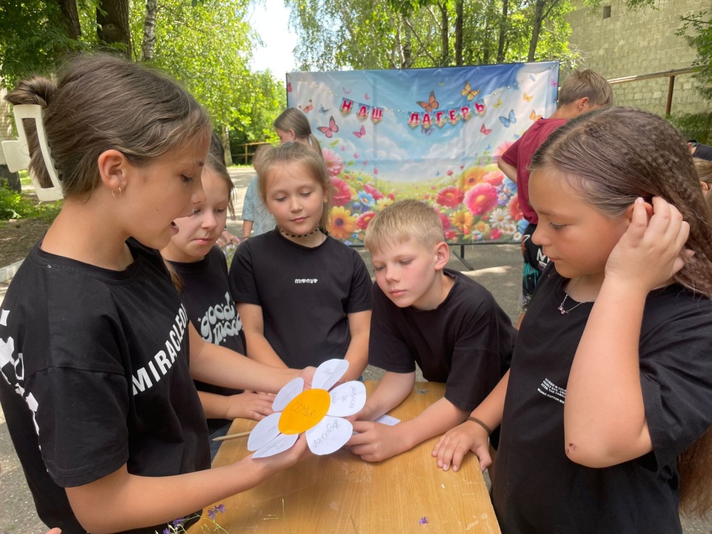 Участники мероприятия назвали пословицы и поговорки о семье, рассказали о любимых занятиях и традициях. Каждый отряд получил набор для изготовления ромашки – желтую середину и белые лепестки. На лепестках школьники написали ответы на вопрос: «Семья – это…» и приклеили к центру цветка.