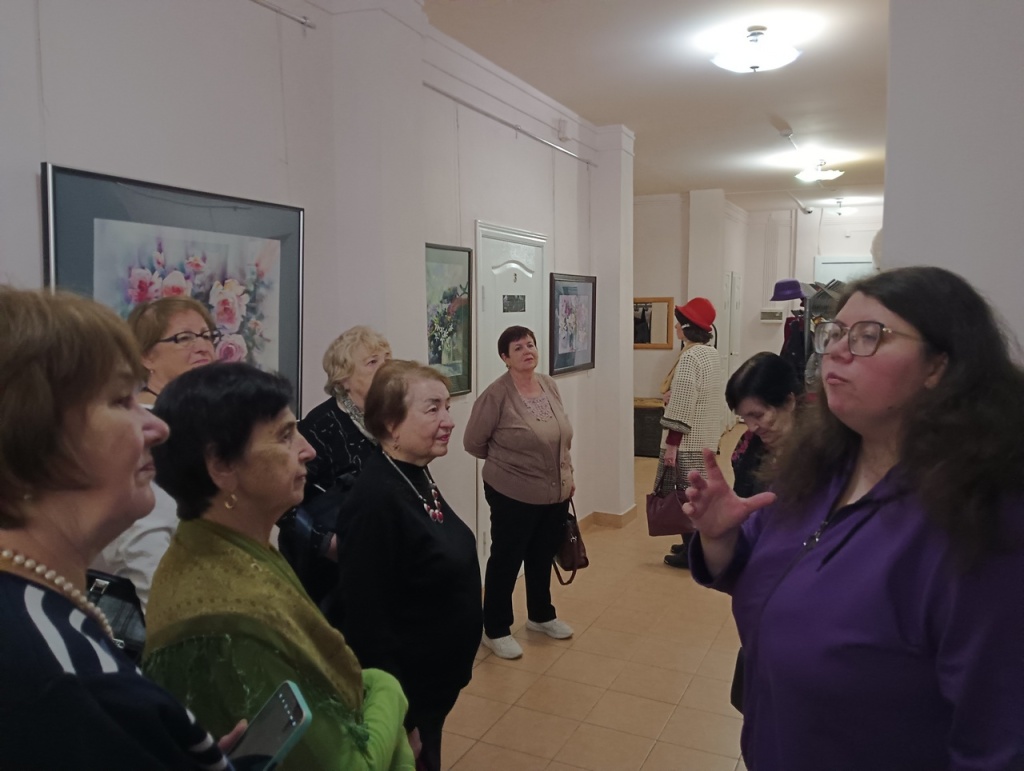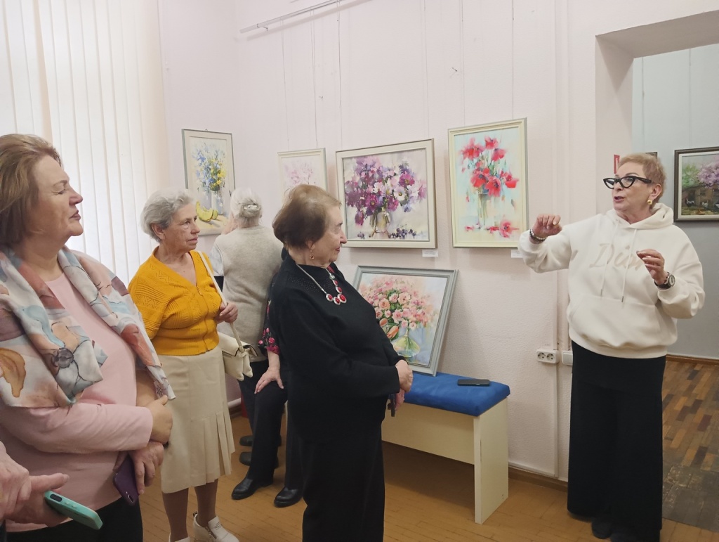 Далее участницы клуба были приглашены на «Бал цветов» - выставку цветочных натюрмортов художницы Марины Мурчич. Заведующий картинной галереей, искусствовед Авдеева Таисия Дмитриевна поделилась интересными подробностями богатейшей истории жанра, рассказала о том, какие тайные смыслы вкладывали голландские художники в натюрморт, какие нешуточные страсти кипели в обществе за право обладать луковицей тюльпана.