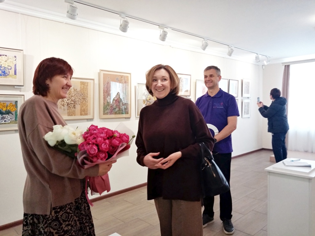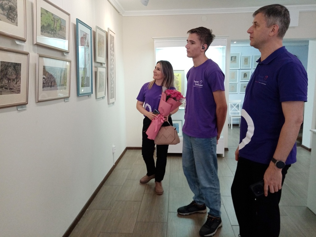 Супруги Николай Александрович и Анна Сергеевна Плужник и их сын Максим, представители Движения Первых из семейного сообщества «Родные-Любимые», поздравили Елену Александровну, поблагодарили за предоставленную возможность насладиться волшебством ее графики и пожелали вдохновения.